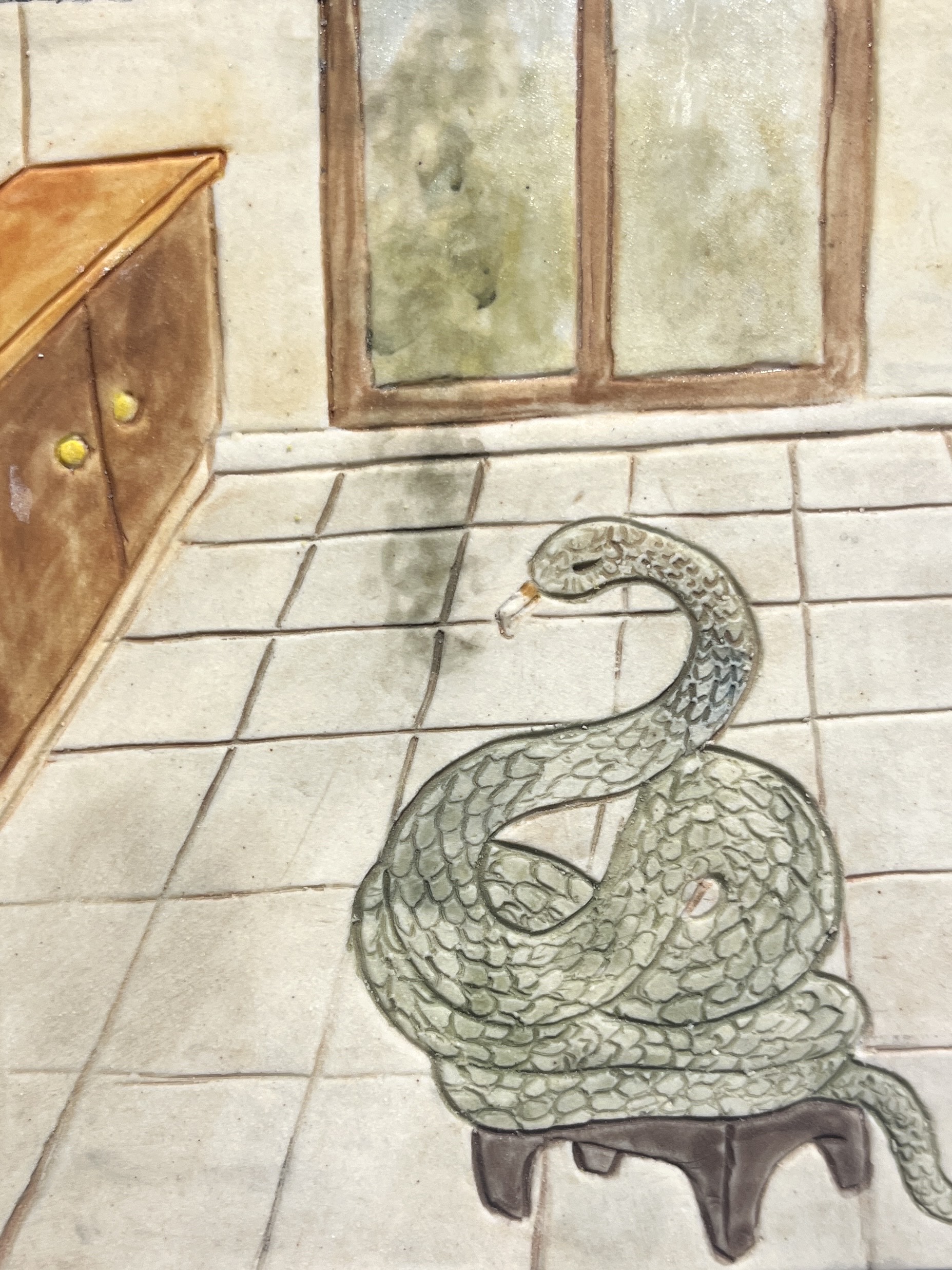 Keywords: Character, Arc, series., Porcelain,, underglaze,, glaze,, wood,, grout., 2025, by, Kirin, Kane.