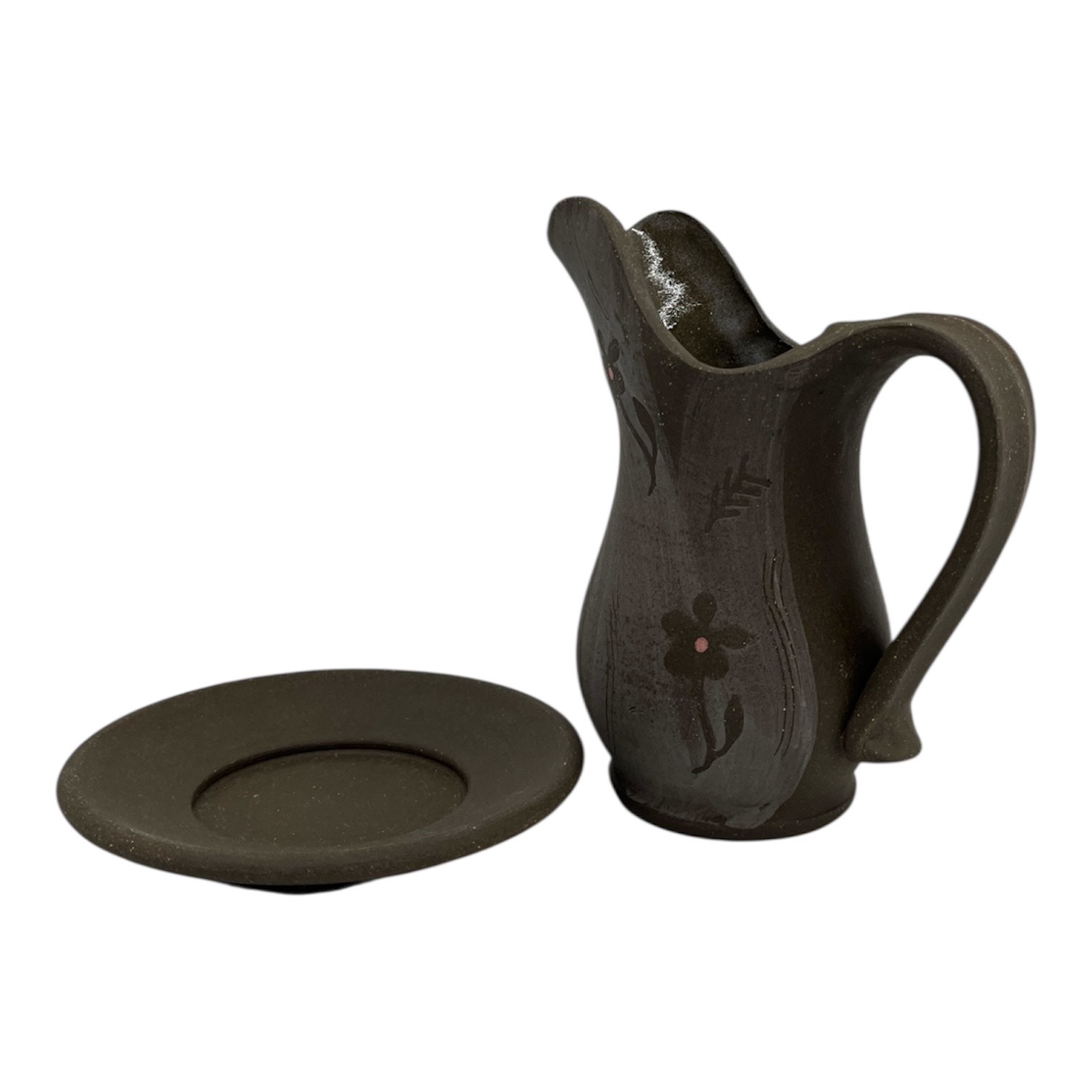 Creamer and Tray, Wheel thrown and constructed, cone 6 dark stoneware. Slip decorated with handmade stencils and underglaze details by Kate Biderbost