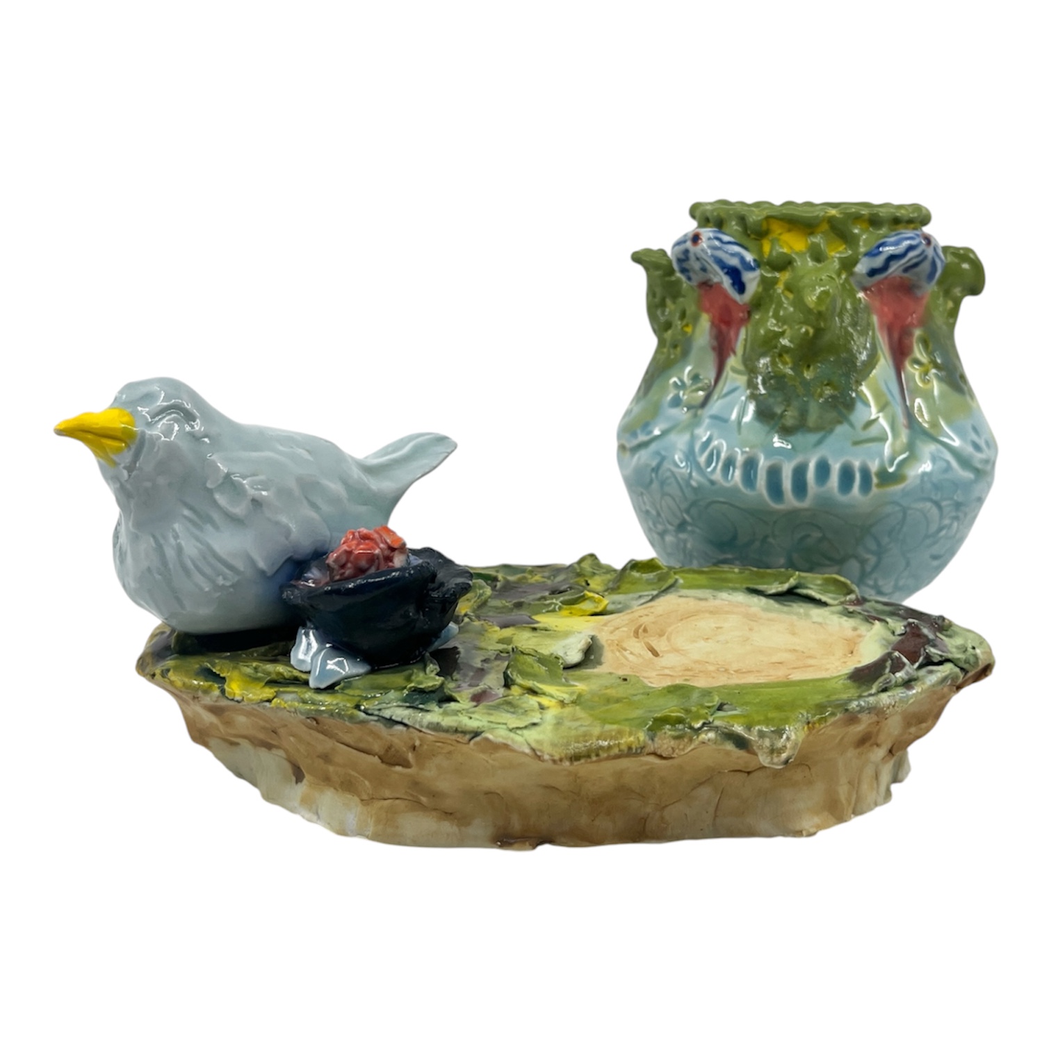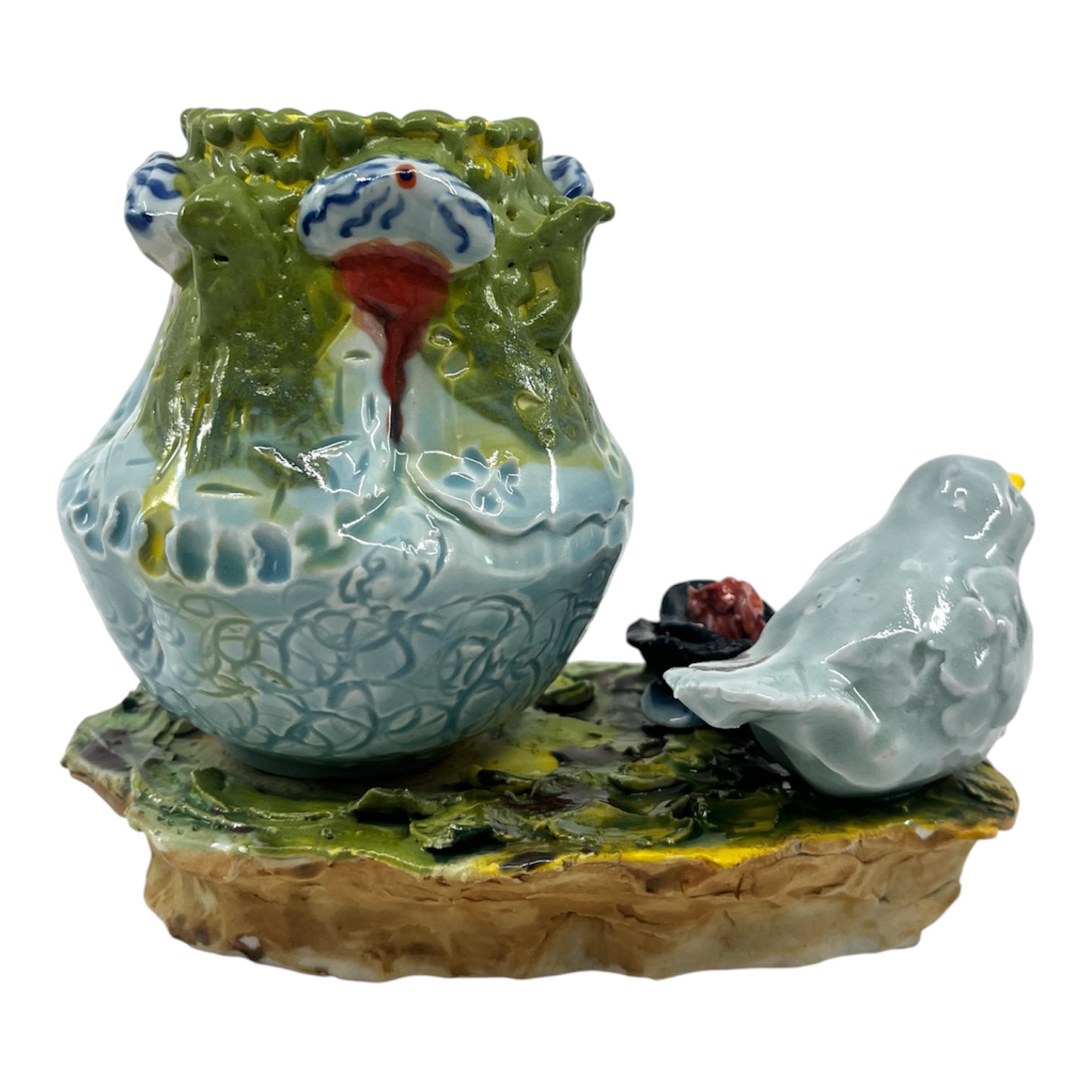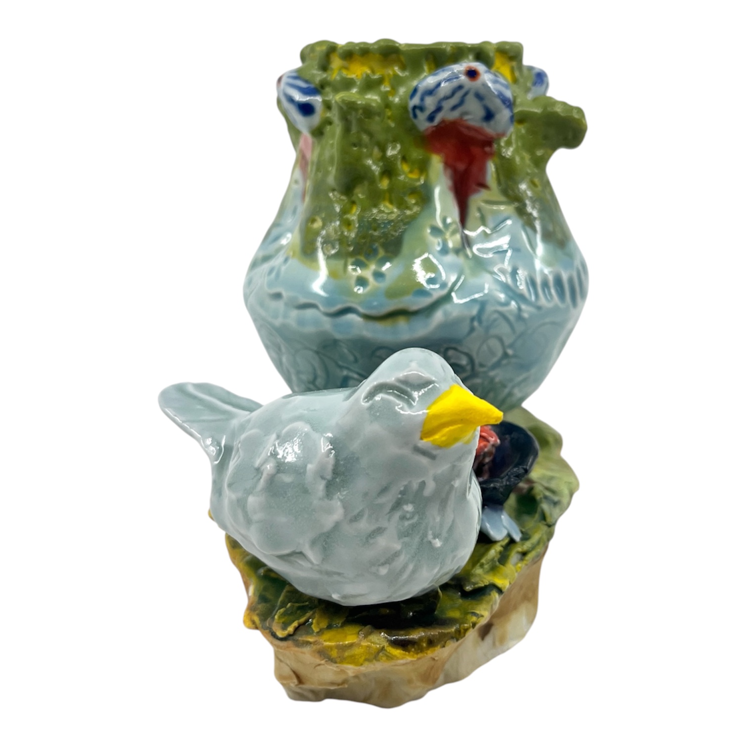 Bird, in, the, Hand, (cup, and, pedestal)., Porcelain,, cone, 10, reduction,, underglaze,, glaze., By, Josh, Martin.,