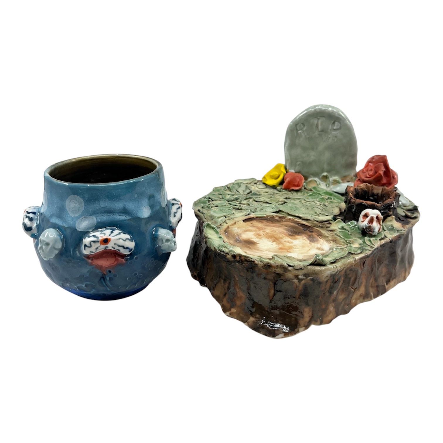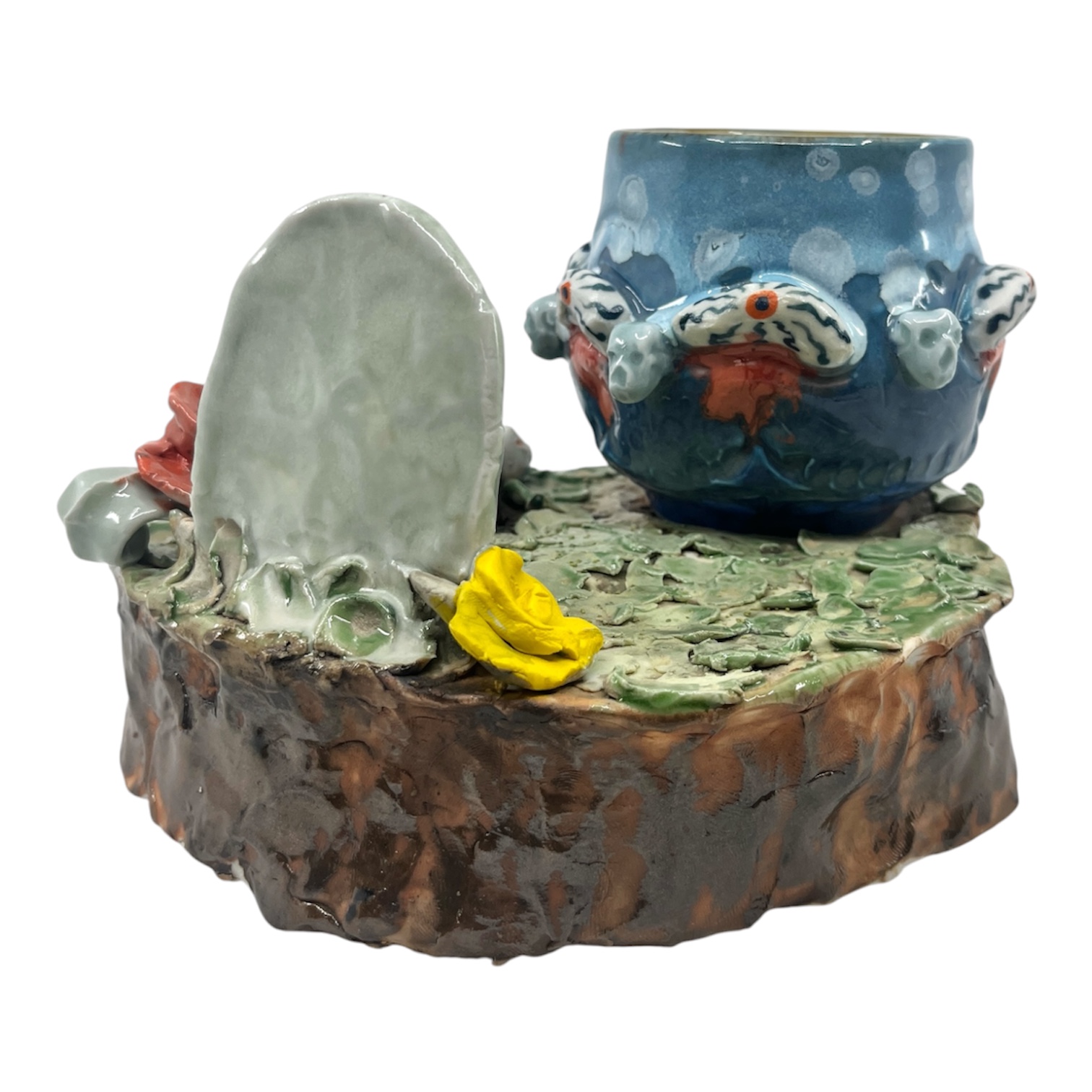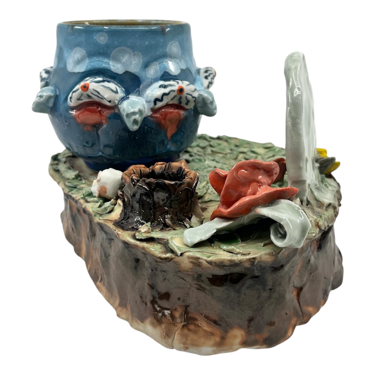 Standing on the Shoulders of Giants (cup and pedestal). Porcelain, cone 10 reduction, underglaze, glaze. By Josh Martin.