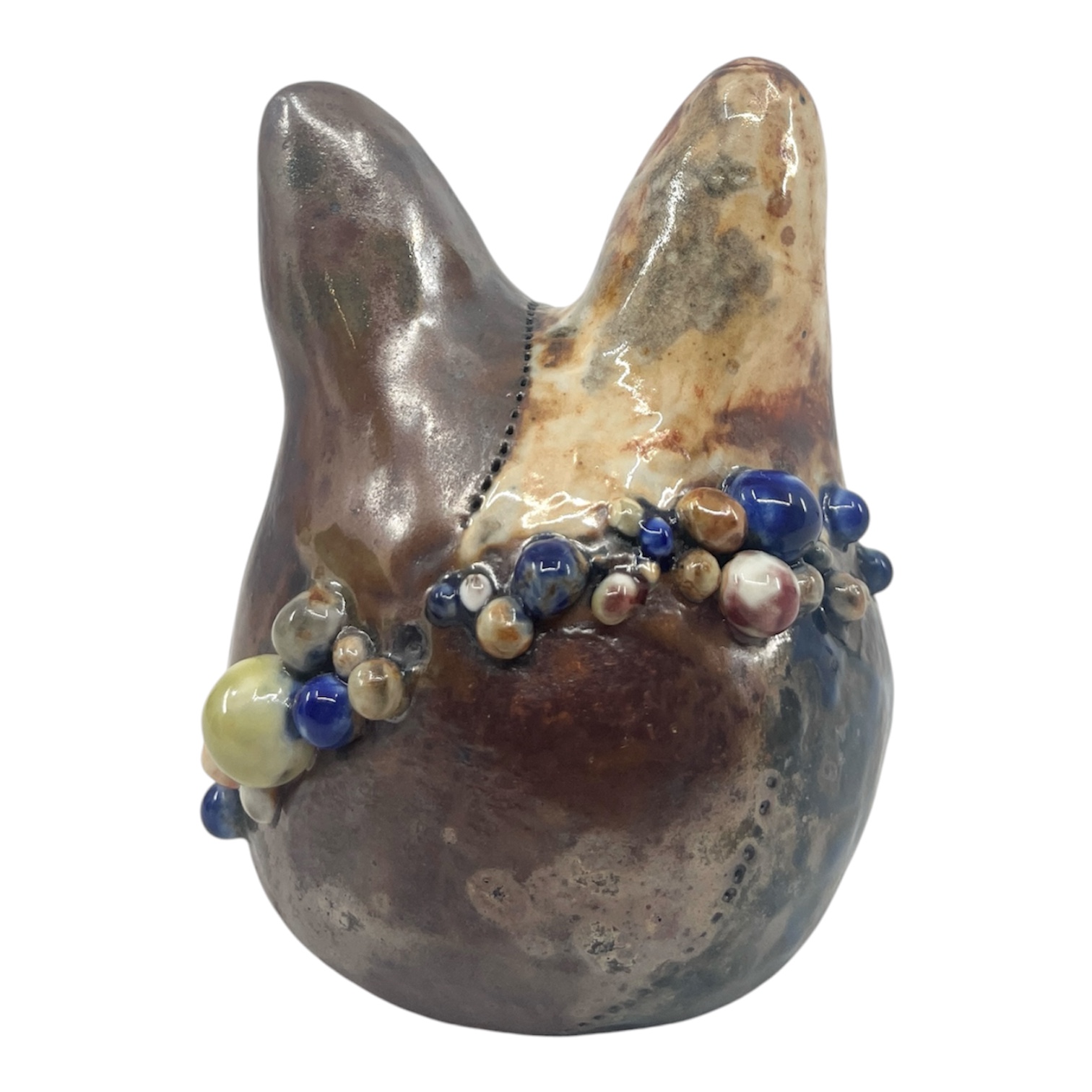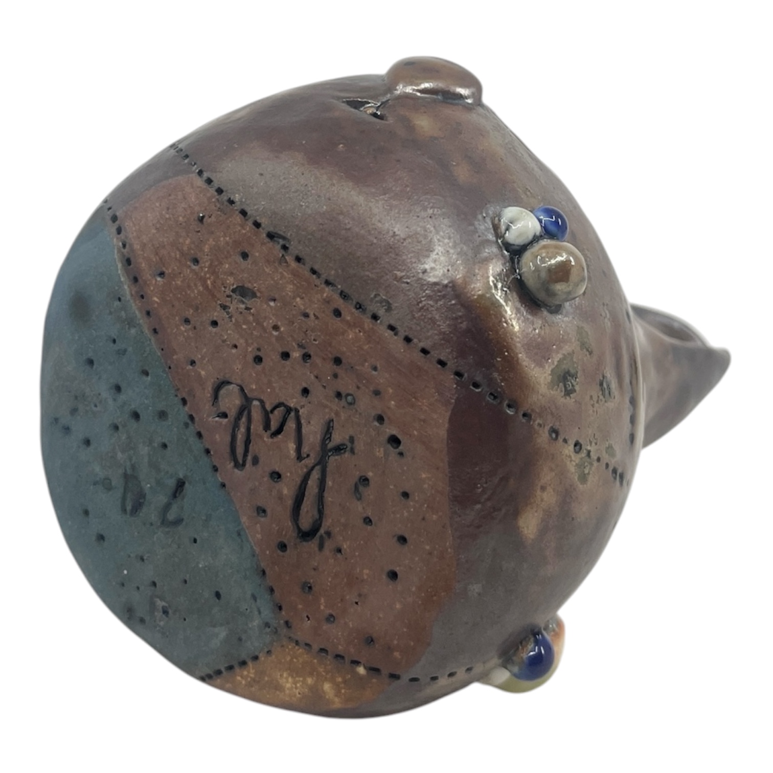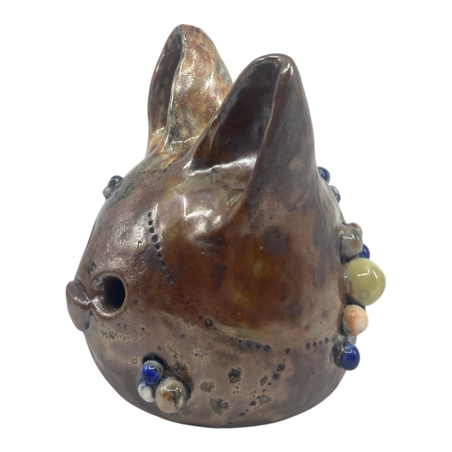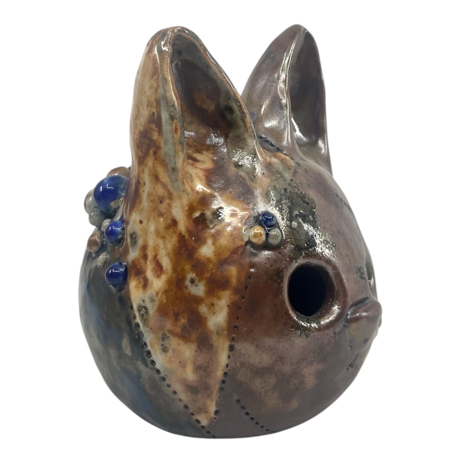 Brown Cat Head with Stars. Cone 10, stoneware, shino. underglaze. By Heather Banas.