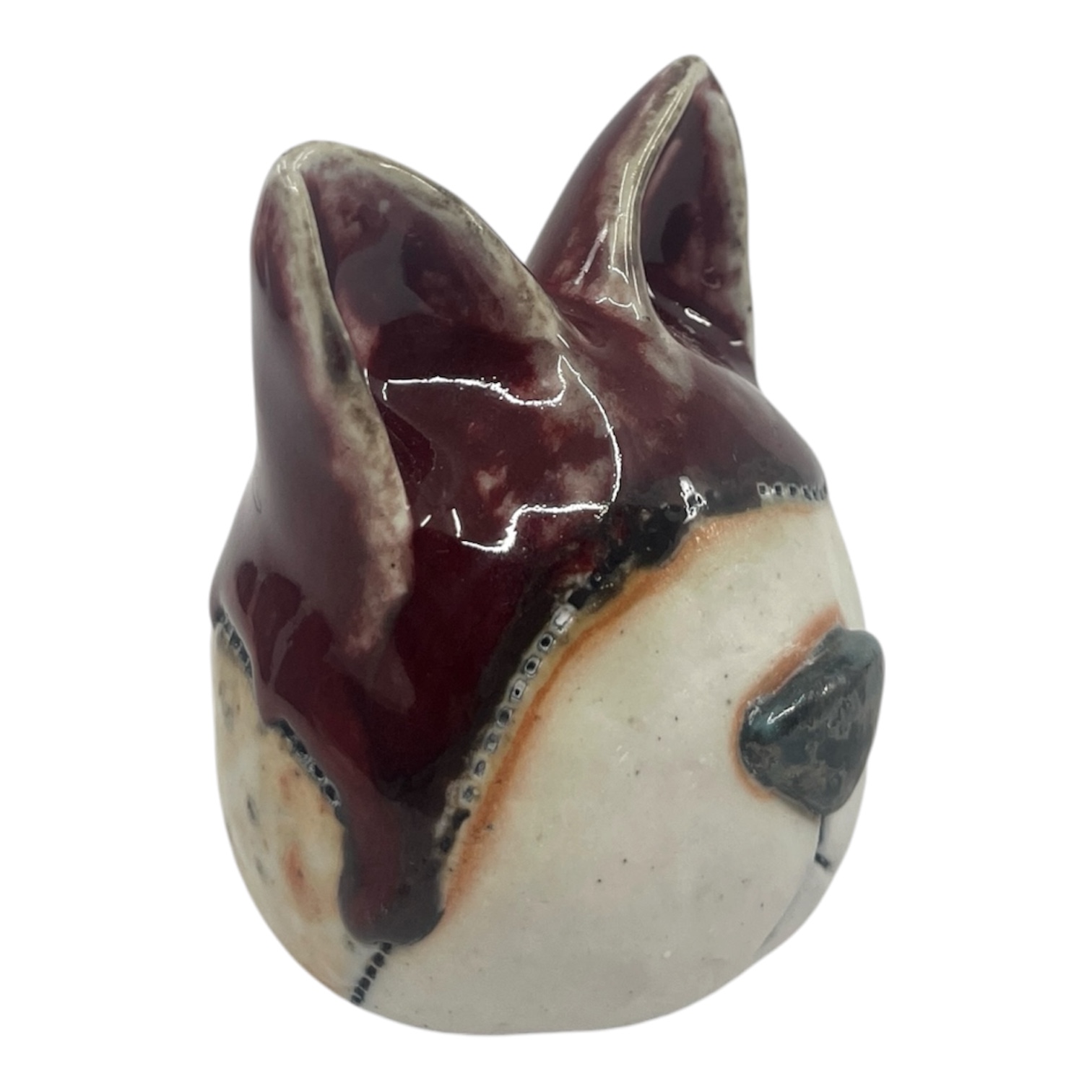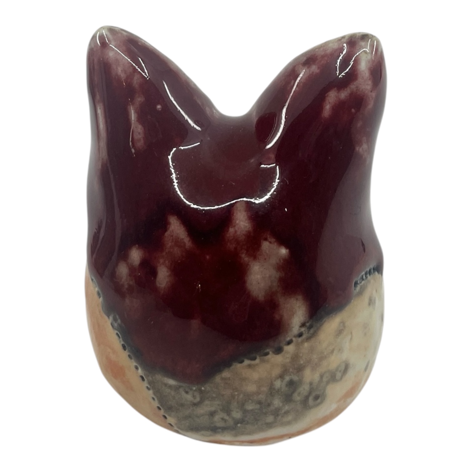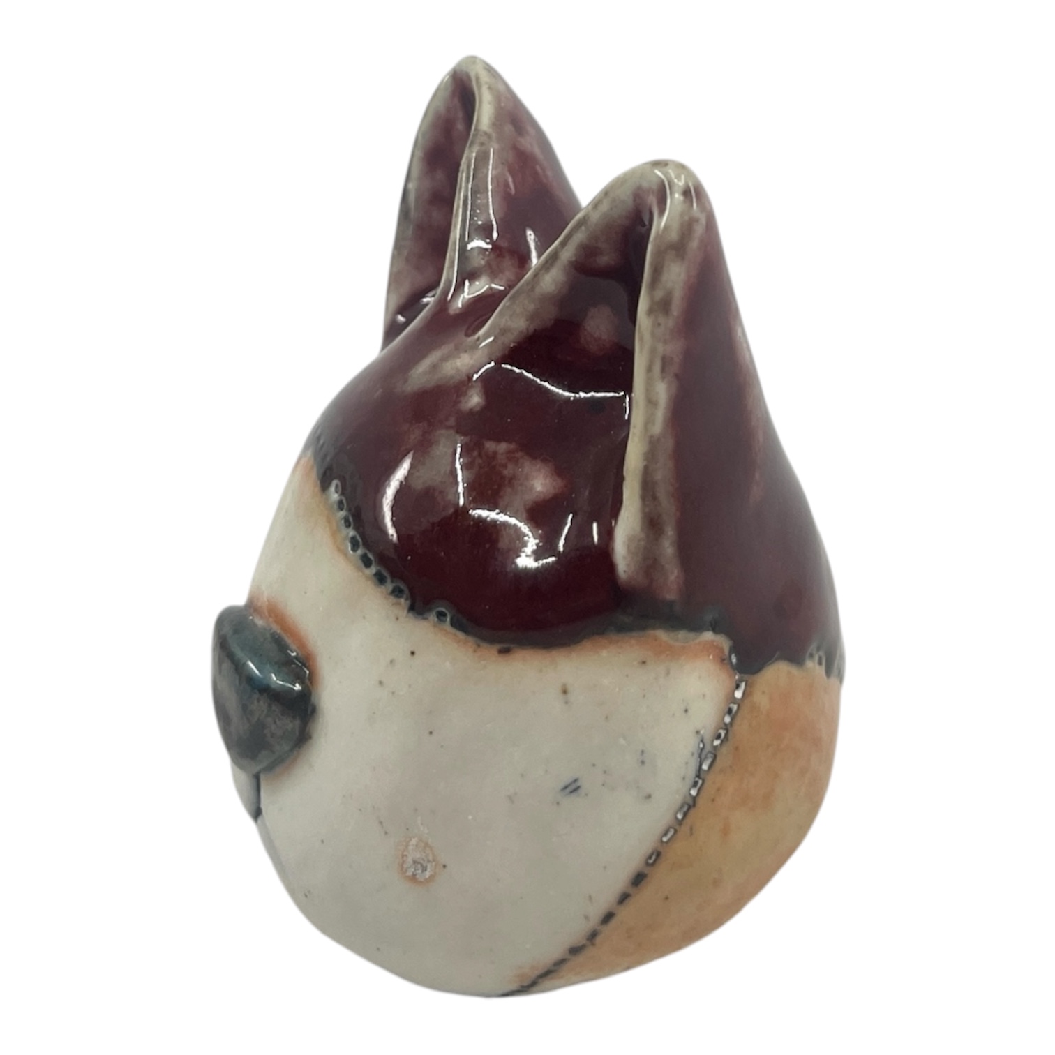 White and Red Cat Head. Cone 10, B-Clay, glaze and underglaze. By Heather Banas.