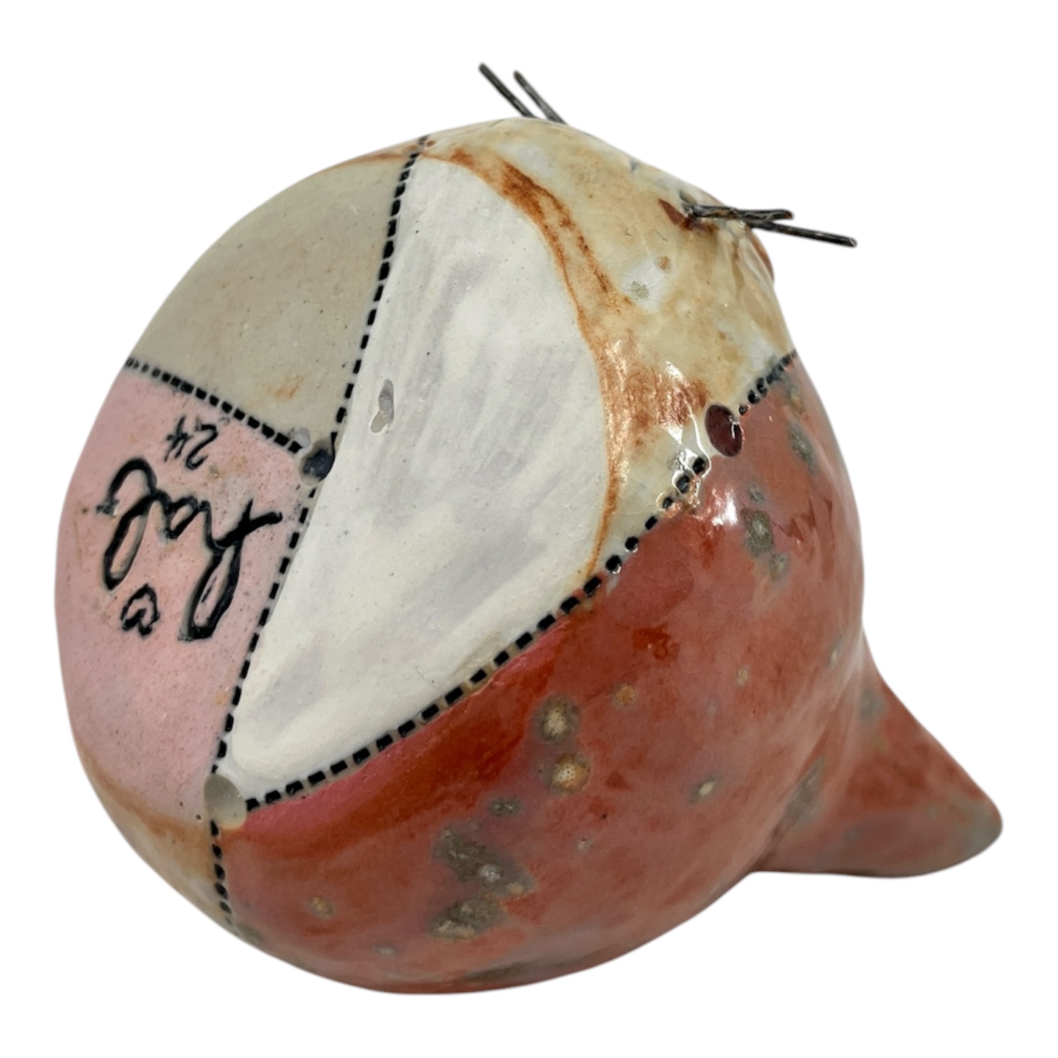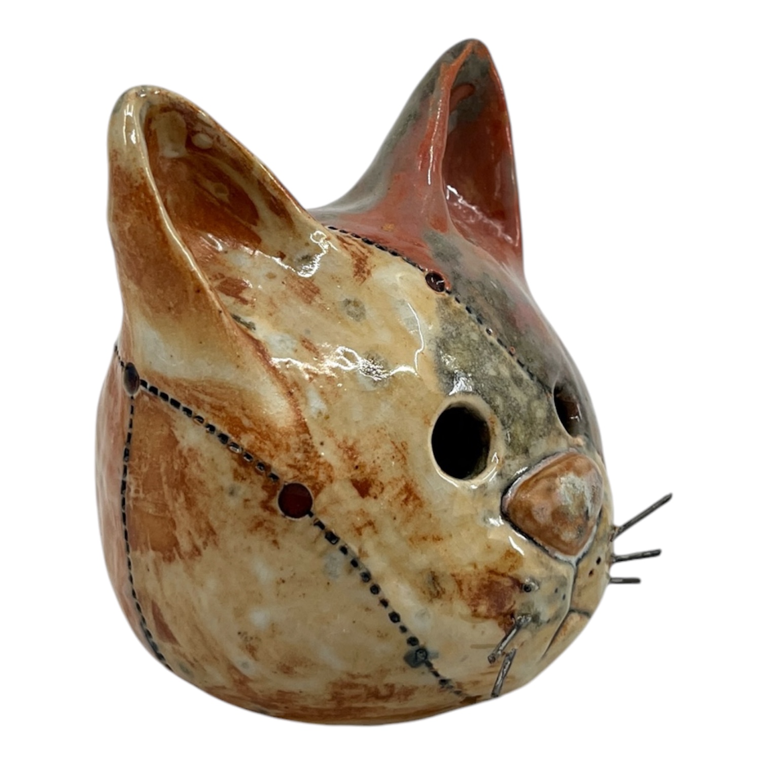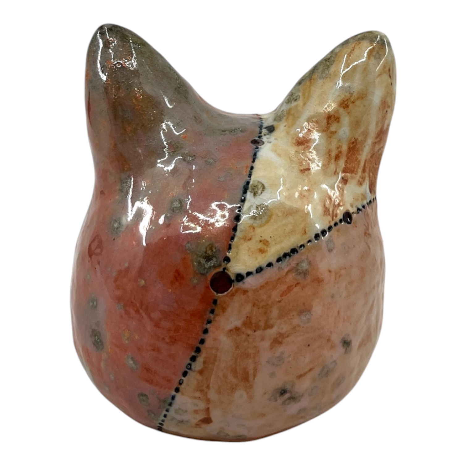 Pink cat head. Cone 10 stoneware with shino, underglaze and nichrome. By Heather Banas.