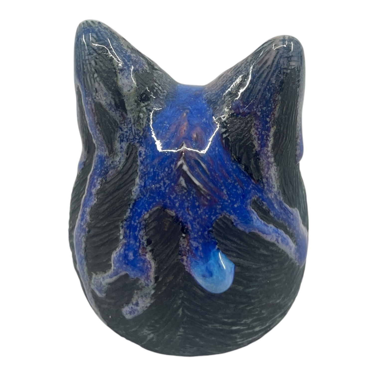 Keywords: Blue, Cat, Head, (Tom's, Purple)., Cone, 10, stoneware, with, underglaze, and, glaze., By, Heather, Banas.,