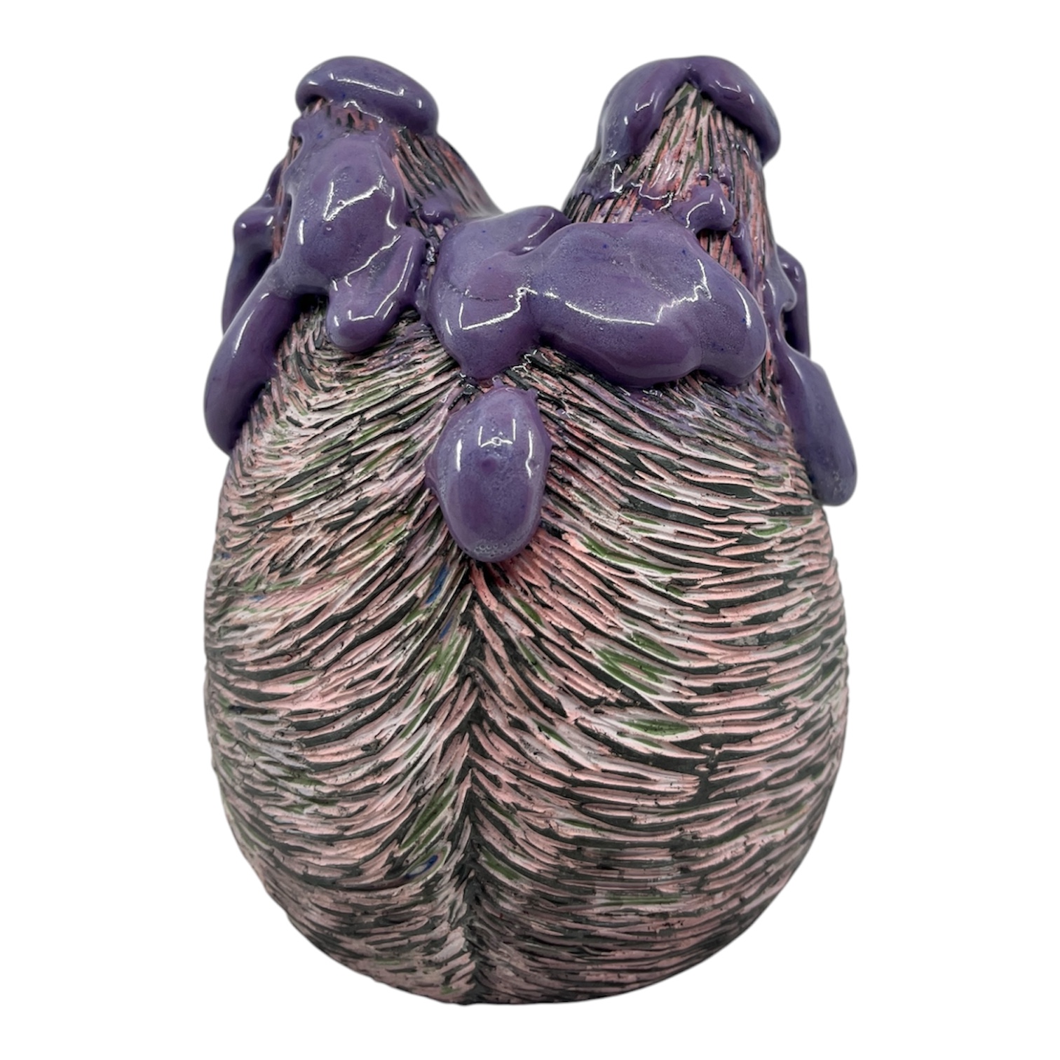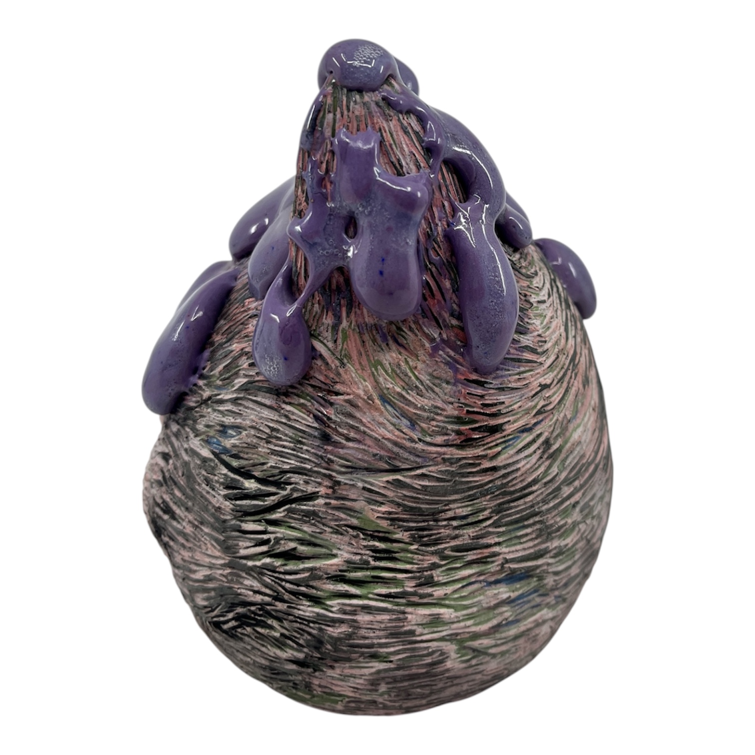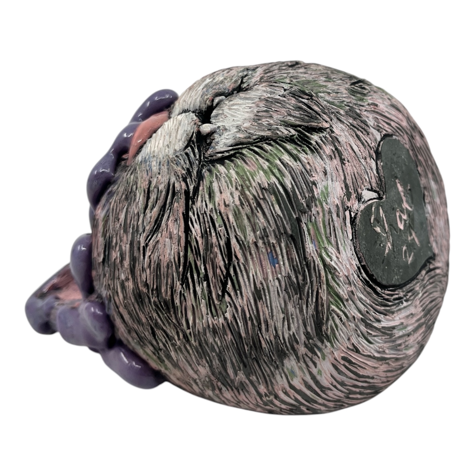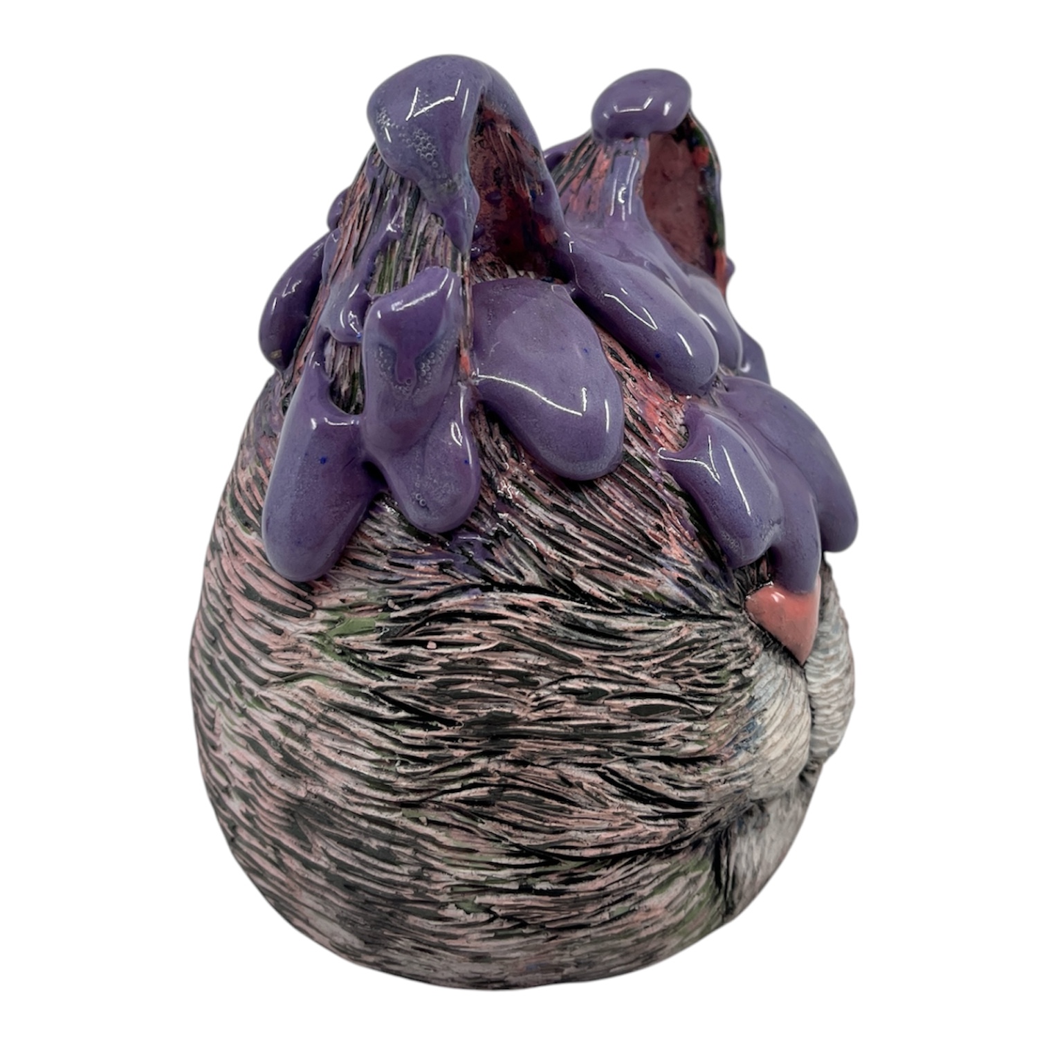 Purple Cat Head. Cone 10 stoneware. Underglaze, gloopy glaze. By Heather Banas.